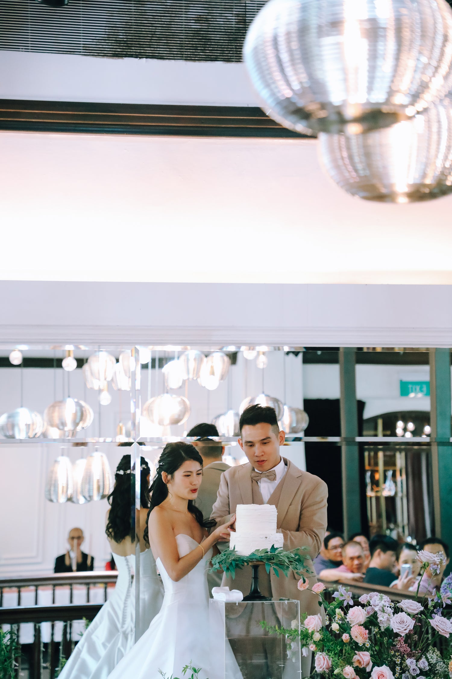 The mirror at the back helped elevate the space and made the space larger! We filled the area with differing heights hedges to create a garden within the indoor dining hall! It was a dream for the couple!