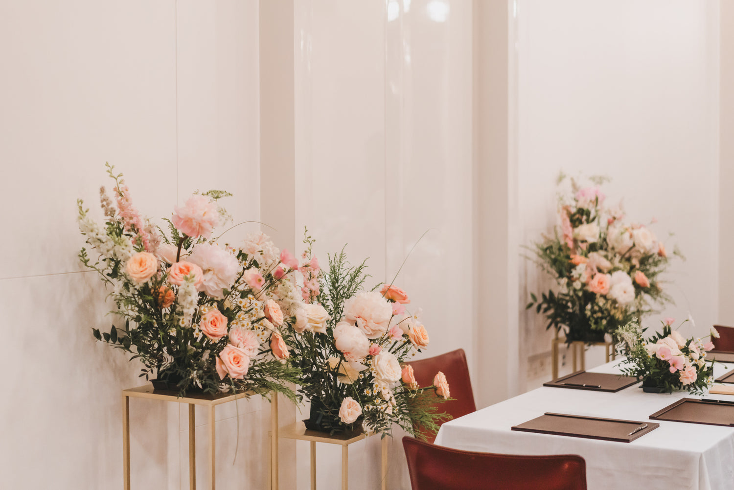 With a sit down solemnisation, the couple opted for our basic solemnisation package which came with 4 floral hedges on gold stands, solemnisation centrepiece and couple chair posies.