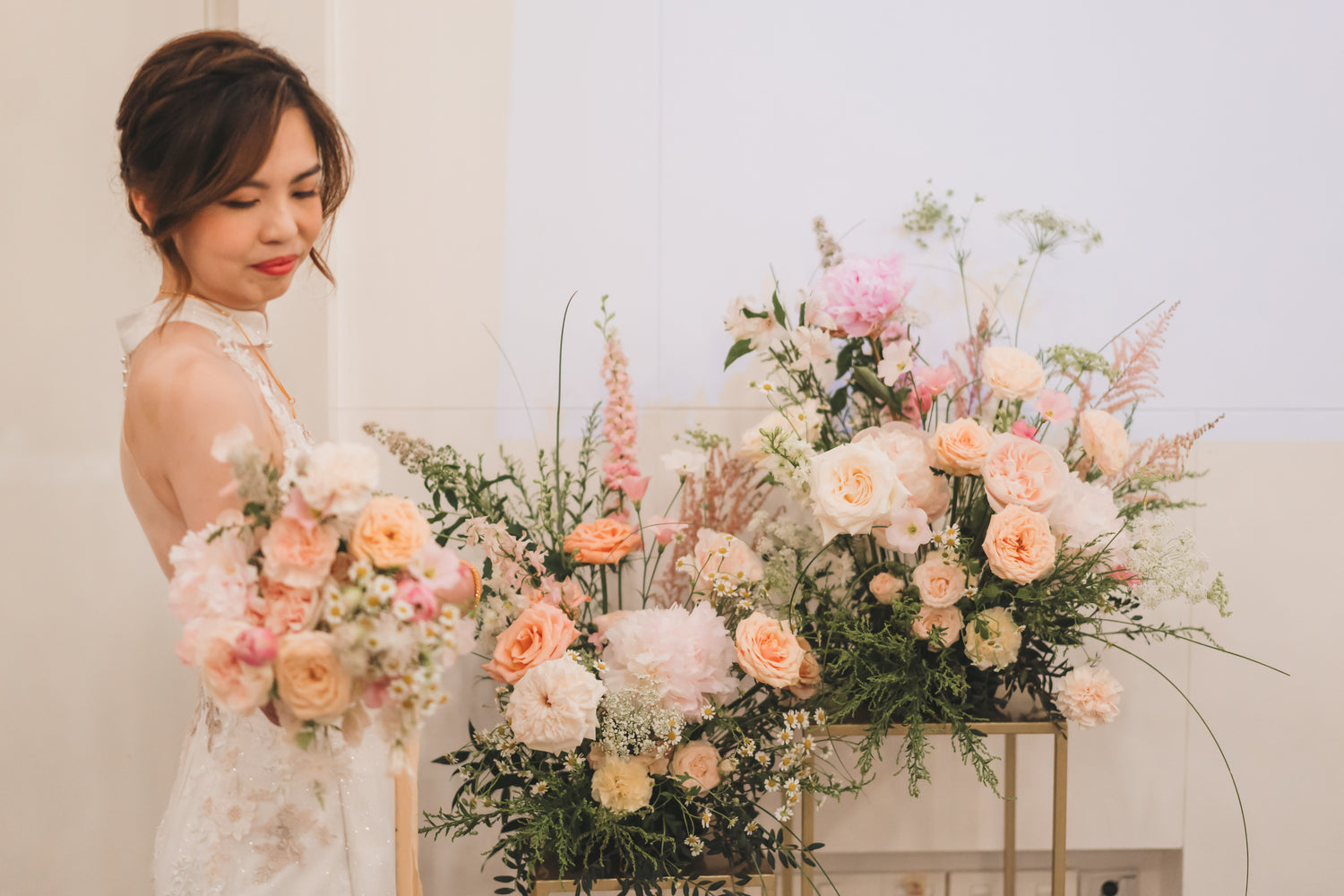 With a strong warm lighting in the interior of the restaurant, we were glad the couple picked a relatively warm colour palette to suit the venue. Paired peachy garden roses with seasonal white peonies and splashes of pinks and yellow to complement the overall theme and look.