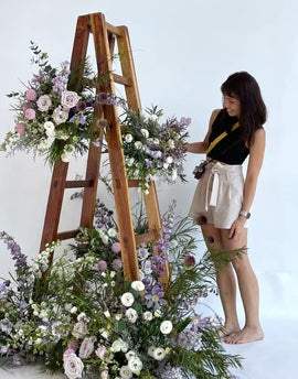 Pairing a rustic wooden ladder with dreamy romantic pastel purple hues. We didnt expect them to turn out so well! Kept the brief to wispy and airy, with dancing blooms growing out of the ladder.