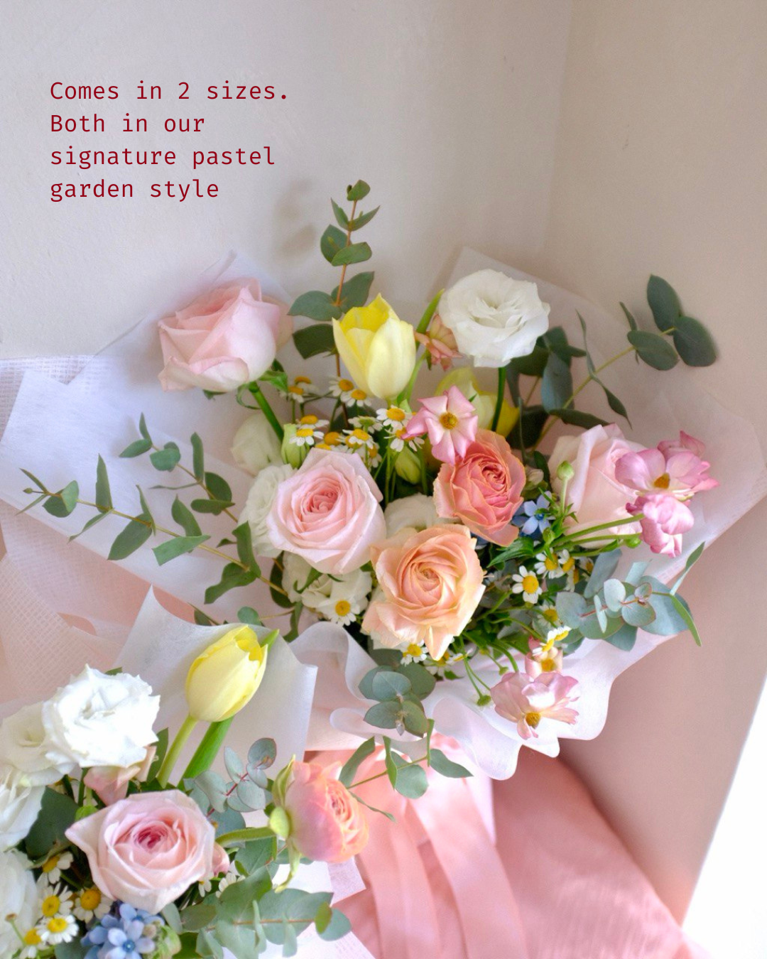 Our signature pastel theme bouquet for Valentine's Day this year! Featuring garden roses, ranunculus, butterfly ranunculus, eustomas, chamomile daisies and oxypetulems.